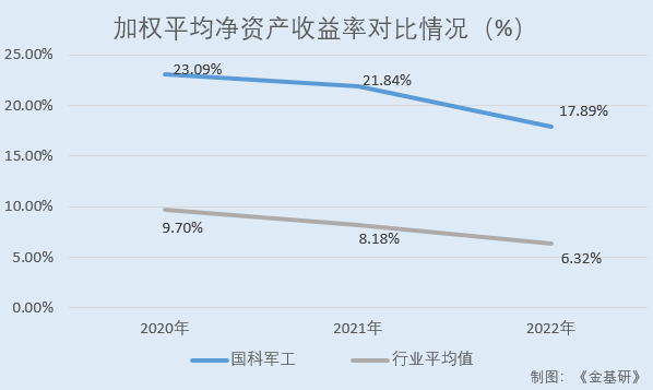 经金基研计算,2020-2022年,上述五家国科军工同行业可比公司的加权平均ROE均值分别为9.70%、8.18%、6.32%。