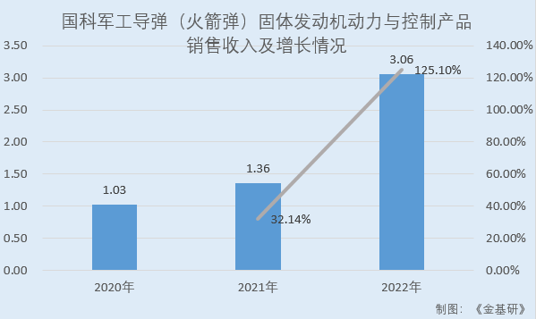 2020-2022年,国科军工导弹(火箭弹)固体发动机动力与控制产品销售收入分别为1.03亿元、1.36亿元、3.06亿元,2021-2022年分别同比增长32.14%、125.10%。