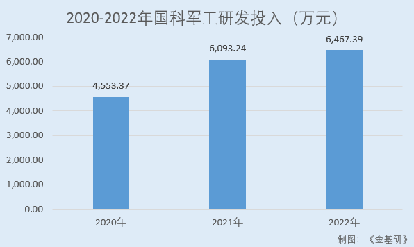 在研发投入方面,2020-2022年,国科军工研发投入分别为4,553.37万元、6,093.24万元、6,467.39万元,累计研发投入占营业收入比例8.21%。