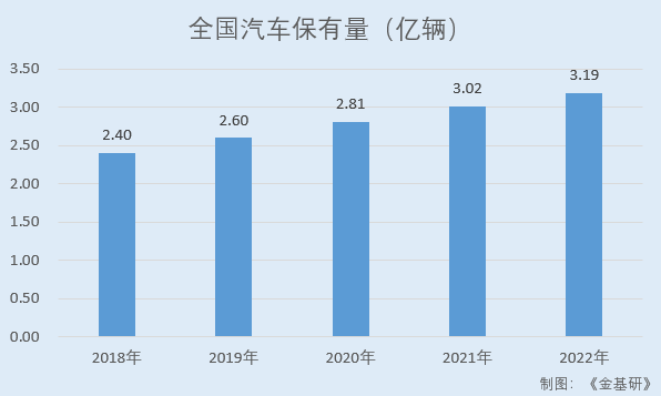 据公安部数据,2018-2022年末,全国汽车保有量分别为2.40亿辆、2.60亿辆、2.81亿辆、3.02亿辆、3.19亿辆,呈逐年上涨趋势。