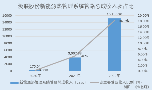 其中,溯联股份新能源热管理系统管路总成收入分别为175.64万元、3,907.88万元、15,196.20万元,占主营业务收入的比例分别为0.30%、5.40%、18.19%。