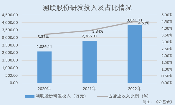 2020-2022年,溯联股份研发投入分别为2,086.11万元、2,786.32万元、3,841.71万元,占当期营业收入比重分别为3.57%、3.84%、4.52%,研发投入及占比总体保持逐年增长的趋势。