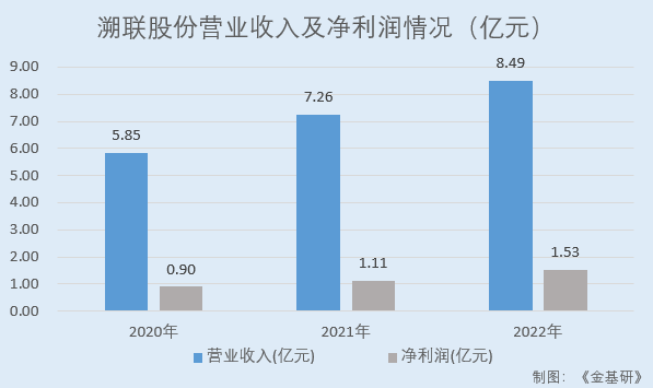 据招股书,2020-2022年,溯联股份实现营业收入分别为5.85亿元、7.26亿元、8.49亿元,2021-2022年分别同比增长24.07%、17.00%;实现净利润分别为0.90亿元、1.11亿元、1.53亿元,2021-2022年分别同比增长24.01%、37.44%。