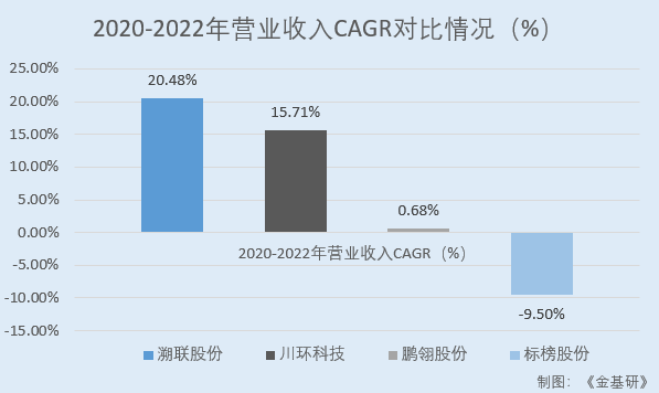 据招股书,2020-2022年,溯联股份的营业收入CAGR达20.48%。同期,溯联股份同行业可比公司四川川环科技股份有限公司(以下简称“川环科技”)的营收CAGR为15.71%;天津鹏翎集团股份有限公司(以下简称“鹏翎股份”)的营收CAGR为0.68%;江阴标榜汽车部件股份有限公司(以下简称“标榜股份”)的营收CAGR为-9.50%。