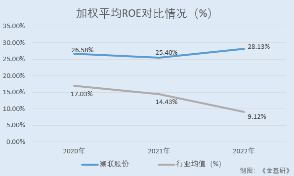 2020-2022年,溯联股份的加权平均ROE分别为26.58%、25.40%、28.13%。同期,溯联股份同行业可比公司川环科技、鹏翎股份、标榜股份的加权平均ROE均值分别为17.03%、14.43%、9.12%。