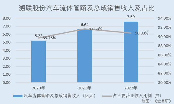 2020-2022年,溯联股份汽车流体管路及总成销售收入分别为5.23亿元、6.64亿元、7.59亿元,占主营业务收入的比例分别为89.76%、91.68%、90.83%。