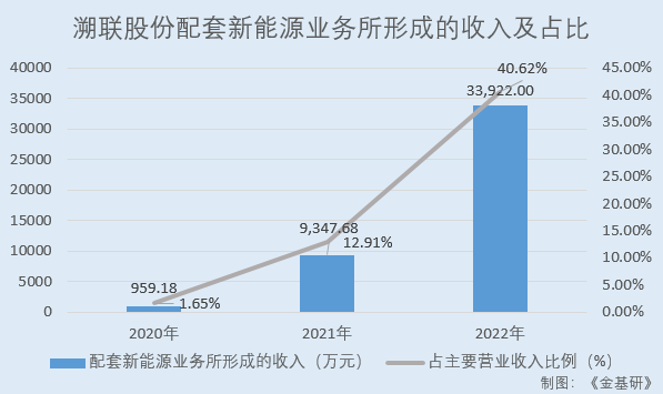 据招股书,2020-2022年,溯联股份配套新能源业务所形成的销售收入分别为959.18万元、9,347.68万元、33,922.00万元,占主营业务收入的比例分别为1.65%、12.91%、40.62%。