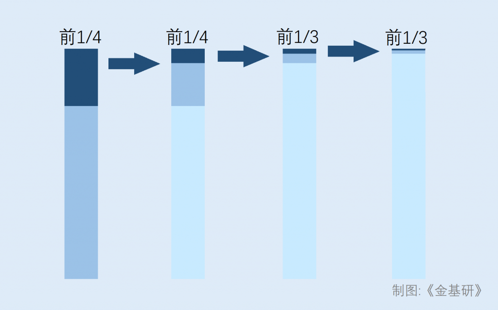 首先,以基金的一年期业绩表现对某类型的全部基金进行从高至低排序,只保留排名前四分之一的基金。