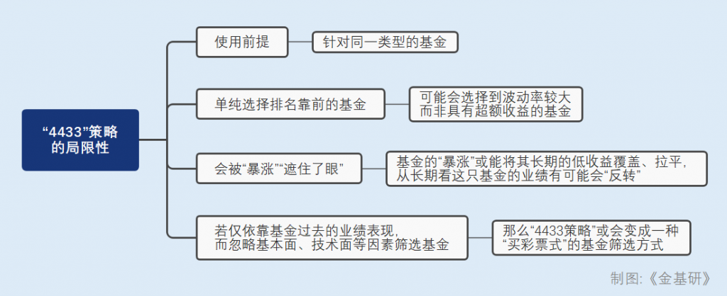 不难看出,通过“4433策略”对基金进行层层筛选,投资者可以在繁多的基金中选出具有持续性业绩良好的“优等生”。但是在实际中,“4433策略”的使用或会存在一定局限性。