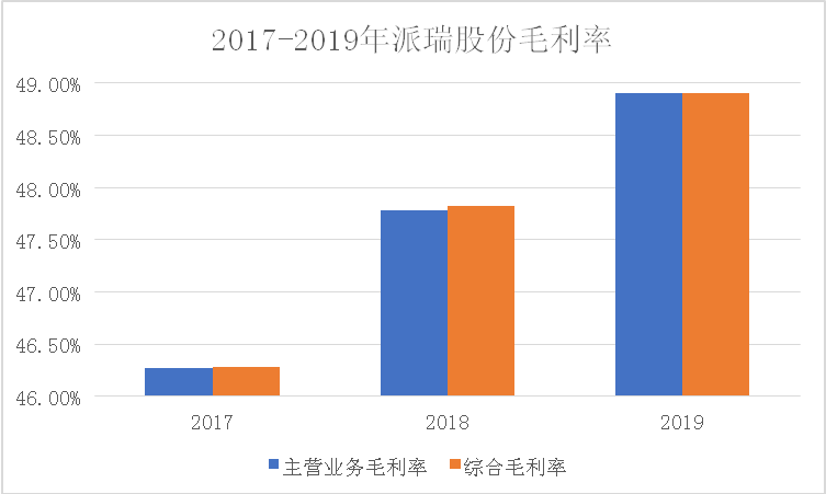 2017-2019年,派瑞股份的主营业务毛利率分别为46.27%、47.78%、48.90%;同期,派瑞股份的综合毛利率分别为46.28%、47.82%、48.91%。