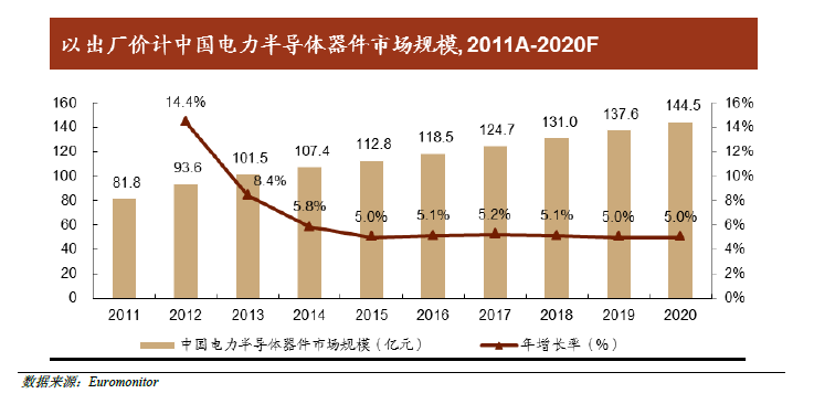 根据Euromonitor发布的《中国电力半导体器件行业研究报告》,2016年至2020年期间,我国电力半导体器件市场规模的年复合增长率为5.08%,预计2020年,市场规模将达到144.5亿元,同比增长5%。