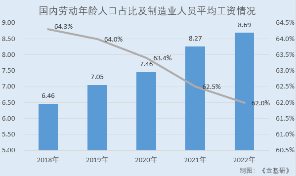相对应的是,国内制造业人员平均工资快速增长。2018-2022年,国内制造业人员平均工资分别为6.46万元、7.05万元、7.46万元、8.27万元、8.69万元。