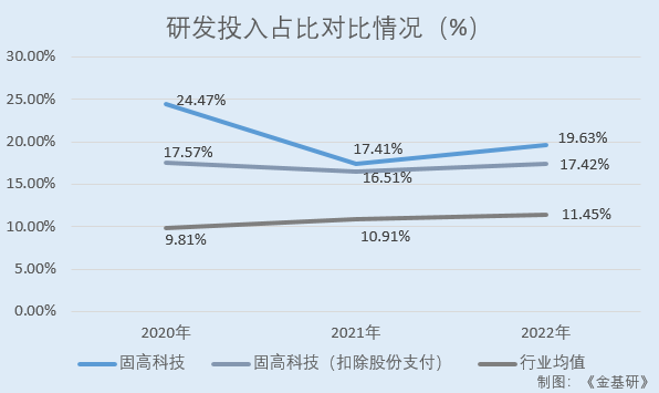 经金基研计算,2020-2022年,上述四家固高科技同行业可比公司的研发投入占比均值分别为9.81%、10.91%、11.45%。
