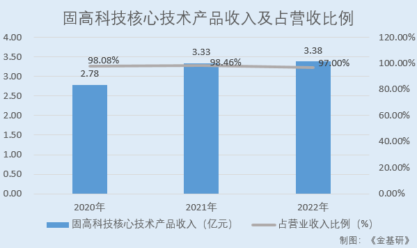 2020-2022年,固高科技核心技术产品收入分别为2.78亿元、3.33亿元、3.38亿元,占营业收入的比例分别为98.08%、98.46%、97.00%。