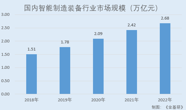 由此,近年来国内智能制造装备行业市场规模持续扩大。据共研网数据,2018-2022年,国内智能制造装备行业市场规模分别为1.51万亿元、1.78万亿元、2.09万亿元、2.42万亿元、2.68万亿元,年均复合增长率达15.42%。