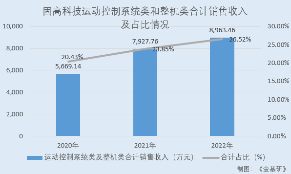 2020-2022年,固高科技运动控制系统类及整机类销售收入合计分别为5,669.14万元、7,927.76万元、8,963.46万元,占主营业务收入的比例合计分别为20.43%、23.85%、26.52%。
