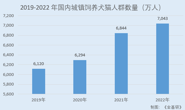 据《2022年中国宠物行业白皮书》数据,2019-2022年,国内城镇饲养犬猫的人群数量分别为6,120万人、6,294万人、6,844万人、7,043万人,呈逐年上涨趋势。