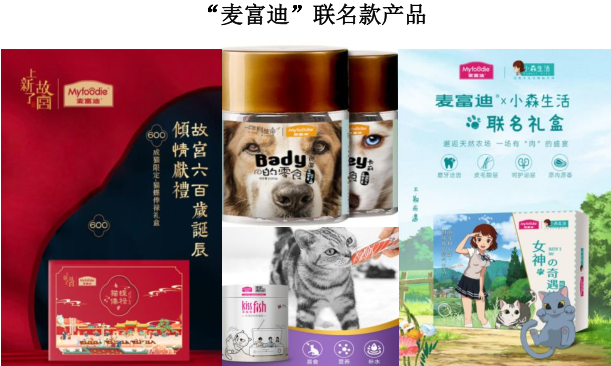 在打造联名款产品方面,乖宝宠物与《上新了·故宫》、《朋友请听好》等综艺节目,《一条狗的使命》电影及《小森生活》手机游戏等多个文娱IP合作打造联名款产品,在丰富自身产品线的同时可以增加产品曝光度和话题传播性,并且通过联名款产品可以辐射更多元的消费群体,最终实现品牌流量增长和经济效益的提升。
