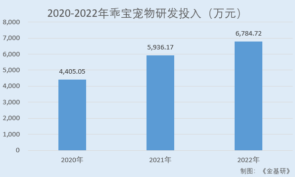 为了保持产品竞争力,乖宝宠物注重新配方、新产品及新工艺的研发,近年来其研发投入金额逐期增长,2020-2022年,乖宝宠物研发投入分别为4,405.05万元、5,936.17万元、6,784.72万元。