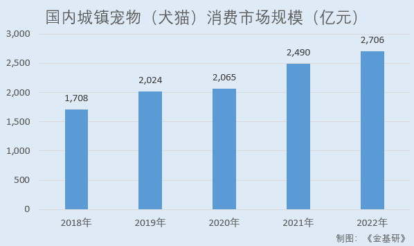 2018-2022年,国内城镇宠物(犬猫)消费市场规模分别为1,708亿元、2,024亿元、2,065亿元、2,490亿元、2,706亿元,年均复合增长率为12.19%,规模持续稳定增长。