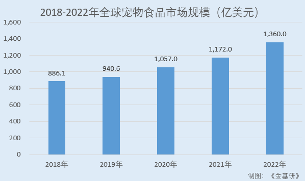据Statista数据,2018-2022年,全球宠物食品市场规模分别为886.1亿美元、940.6亿美元、1,057.0亿美元、1,172.0亿美元、1,360.0亿美元,预计2023年全球宠物食品市场规模将达到1,473.00亿美元。