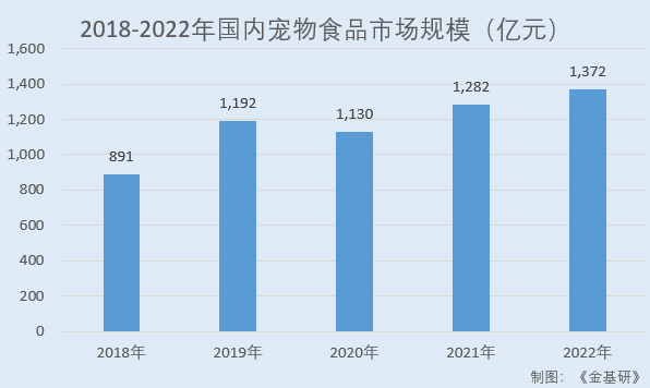 据国家统计局数据,2018-2022年,国内宠物食品行业市场规模分别为891亿元、1,192亿元、1,130亿元、1,282亿元、1,372亿元,年均复合增长率为11.40%。