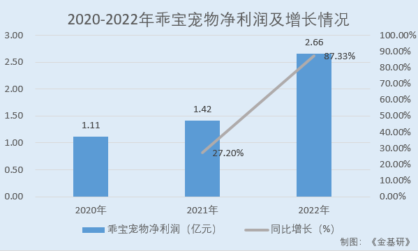 同期,乖宝宠物的净利润分别为1.11亿元、1.42亿元、2.66亿元,2021-2022年分别同比增长27.20%、87.33%。