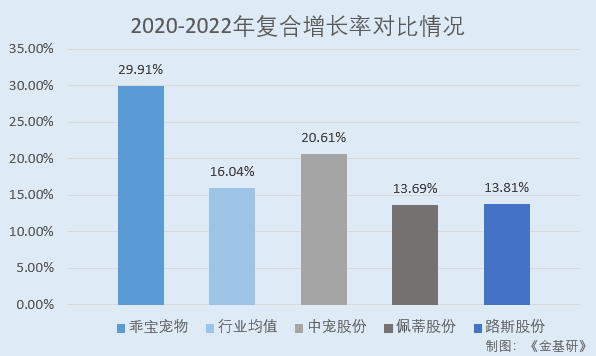 经金基研计算,2020-2022年,上述三家乖宝宠物同行业可比公司的营收CAGR均值为16.04%。需要说明的是,上海福贝宠物用品股份有限公司(以下简称“福贝宠物”)未披露2022年财务数据,故未列入比较。
