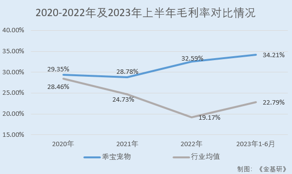 据招股书,2020-2022年及2023年1-6月,乖宝宠物的毛利率分别为29.35%、28.78%、32.59%、34.21%。同期,乖宝宠物同行业可比公司中宠股份、佩蒂股份、福贝宠物、路斯股份的毛利率均值分别为28.46%、24.73%、19.17%、22.79%(佩蒂股份和福贝宠物未披露2023年上半年财务数据,故未列入2023年上半年比较,下同)。