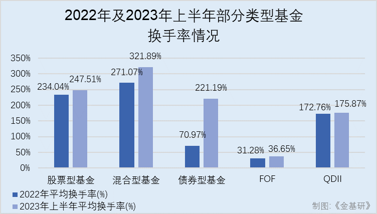 据东方财富数据,经测算,2022年,股票型基金、混合型基金、债券型基金、FOF、QDII的平均换手率分别为234.04%、271.07%、70.97%、31.28%、172.76%;2023年上半年,上述五类基金的换手率则分别为247.51%、321.89%、221.19%、36.65%、175.87%。
