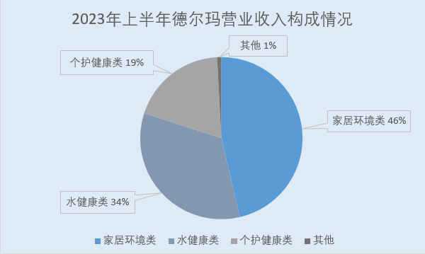 其中,德尔玛家居环境类业务收入7.20亿元,占营收比46.32%,同比增长1.97%;水健康类业务收入5.24亿元,占营收比33.68%,同比增长14.44%;个护健康类业务收入2.98亿元,占营收比19.15%,同比增长5.51%。
