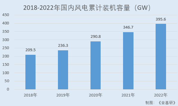 据国家能源局数据,2018-2022年,国内风电累计装机容量分别为209.5GW、236.3GW、290.8GW、346.7GW、395.6GW,年均CAGR为17.22%。