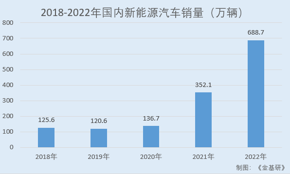 据中国汽车工业协会数据,2018-2022年,国内新能源汽车销量分别为125.6万辆、120.6万辆、136.7万辆、352.1万辆、688.7万辆,年均复合增长率达53.02%。