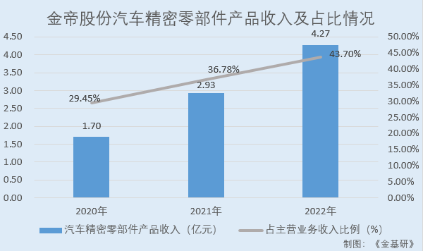 2020-2022年,金帝股份汽车精密零部件产品收入分别为1.70亿元、2.93亿元、4.27亿元,年均CAGR达58.63%。该业务收入占主营业务收入的比例亦呈持续上升趋势,分别为29.45%、36.78%、43.70%。