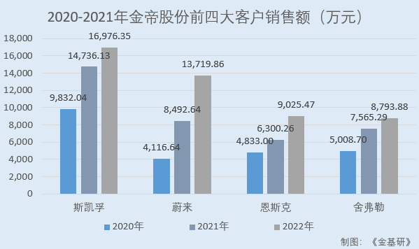 2020-2022年,金帝股份前五大客户分别为斯凯孚、蔚来、恩斯克、舍弗勒、长城、烟台天成,其中斯凯孚均为其第一大客户,2021年长城替代烟台天成进入前五大客户行列。