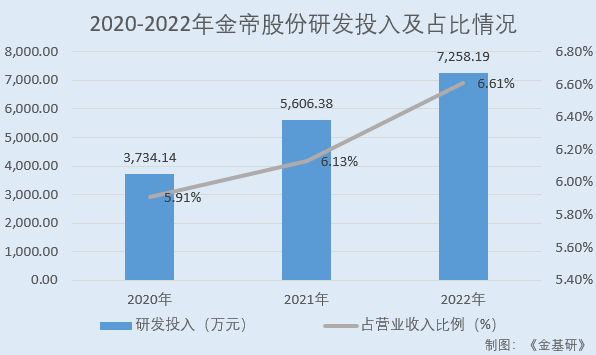2020-2022年,金帝股份的研发投入金额分别为3,734.14万元、5,606.38万元、7,258.19万元,占当期营业收入的比例分别为5.91%、6.13%、6.61%,逐年增加。