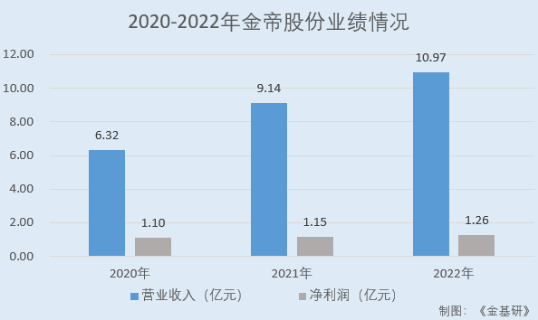 近年来,金帝股份营业收入、净利润均保持稳健增长。据招股书,2020-2022年,金帝股份分别实现营业收入6.32亿元、9.14亿元、10.97亿元,净利润分别为1.10亿元、1.15亿元、1.26亿元。