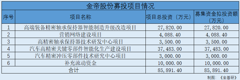 此番上市,金帝股份拟募集资金8.59亿元,分别用于高端装备精密轴承保持器智能制造升级改造项目、营销网络建设项目、高精密轴承保持器技术研发中心项目、汽车高精密关键零部件智能化生产建设项目、汽车精密冲压零部件技术研究中心项目和补充营运资金项目。