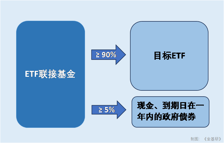 在投资上,一般来说,ETF联接基金投资于其目标ETF的比例不低于基金净资产的90%,同时还预留了不少于5%的高流动性资产(如现金、到期日在一年以内的政府债券等),以应对投资者的赎回。