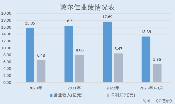 2020-2022年及2023年1-9月,敷尔佳营业收入分别为15.85亿元、16.50亿元、17.69亿元、13.39亿元,净利润分别为6.48亿元、8.06亿元、8.47亿元、5.36亿元。