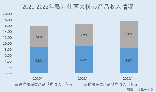 2020-2022年,敷尔佳医疗器械类敷料产品销售收入分别为8.80亿元、9.28亿元、8.66亿元,占主营业务收入的比例分别为55.54%、56.25%、48.95%;化妆品类功能性护肤品的销售收入分别为7.05亿元、7.22亿元、9.03亿元,占主营业务收入的比例分别为44.46%、43.75%、51.05%。