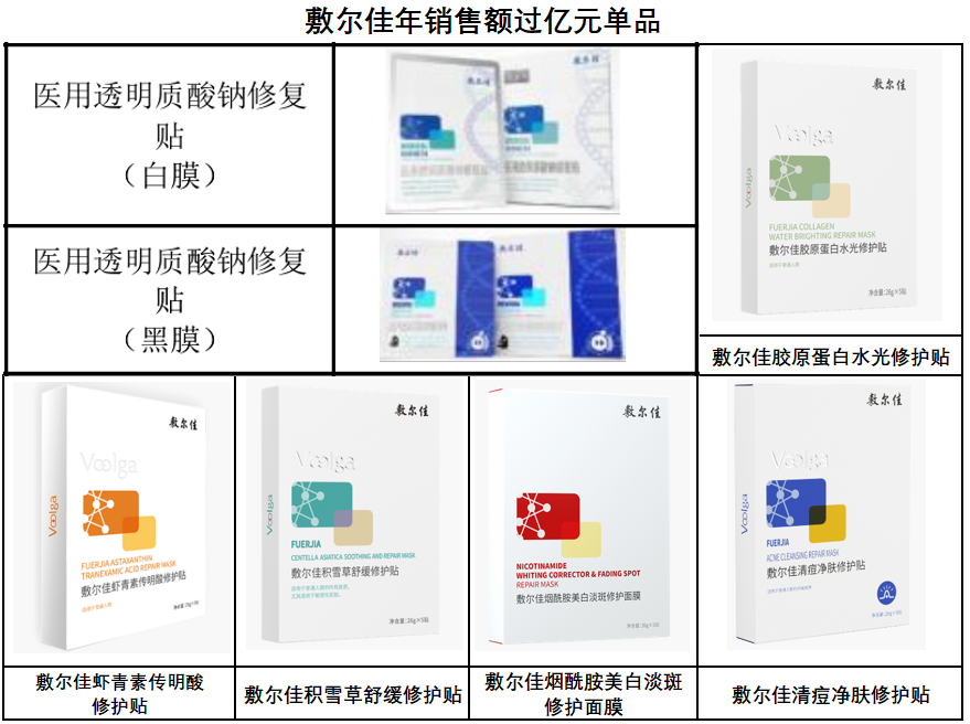 通过多年的口碑传播和品牌推广,敷尔佳已拥有七个年销售额过亿元的单品。包括:医用透明质酸钠修复贴(白膜)、医用透明质酸钠修复贴(黑膜)、敷尔佳积雪草舒缓修护贴、敷尔佳胶原蛋白水光修护贴、敷尔佳虾青素传明酸修护贴、敷尔佳烟酰胺美白淡斑修护面膜、敷尔佳清痘净肤修护贴。