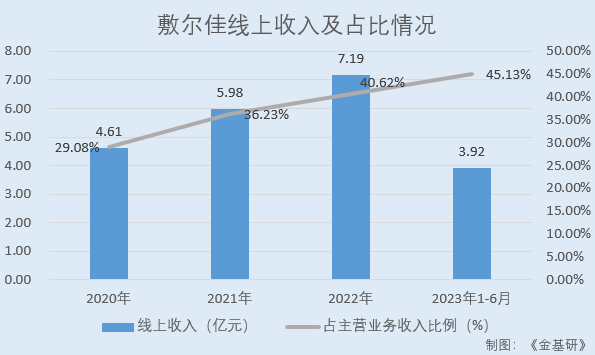 2020-2022年及2023年1-6月,敷尔佳线上收入分别为4.61亿元、5.98亿元、7.19亿元、3.92亿元,占主营业务收入的比重分别为29.08%、36.23%、40.62%、45.13%。