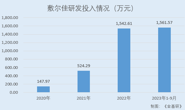 随着研发模式的转变,近年来敷尔佳的研发投入逐年加大。2020-2022年及2023年1-9月,敷尔佳研发投入分别为147.97万元、524.29万元、1,542.61万元、1,561.57万元。其中,2023年1-9月,敷尔佳研发投入同比增长40.26%。