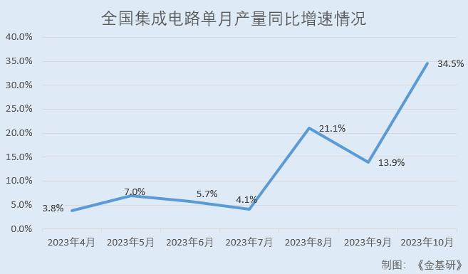 2023年上半年,由于芯片产业链去库存已初见成效,半导体行业出现复苏迹象。据国家统计局数据,2023年4-10月,全国集成电路单月产量同比增速分别为3.8%、7.0%、5.7%、4.1%、21.1%、13.9%、34.5%。