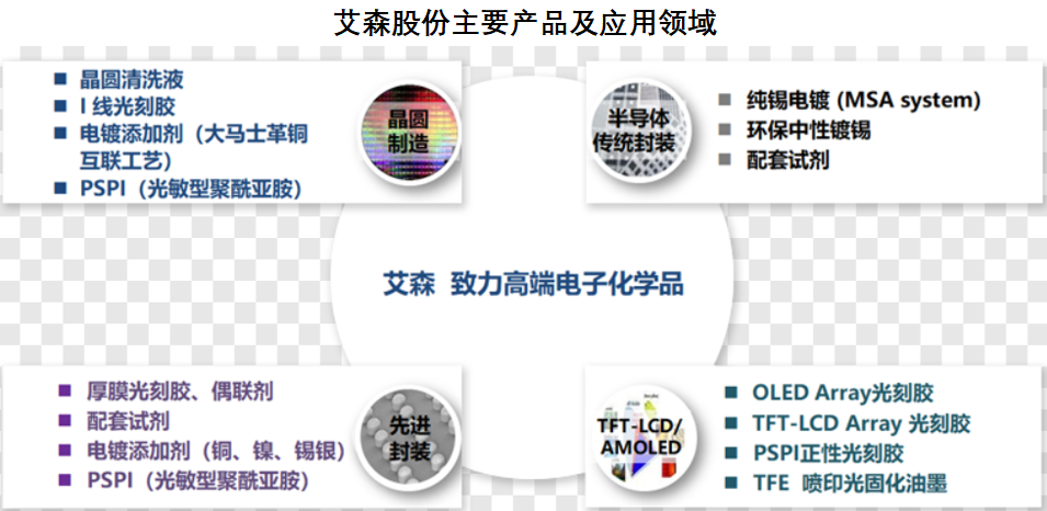 自2010年成立以来,艾森股份以半导体传统封测的电镀系列化学品起步,不断取代国外材料公司在该领域的市场份额,成为该领域的主力供应商。同时,艾森股份在先进封装、晶圆制造及OLED阵列制造领域的电镀液及配套试剂、光刻胶及配套试剂已经实现技术突破,敲响光刻胶行业大门。