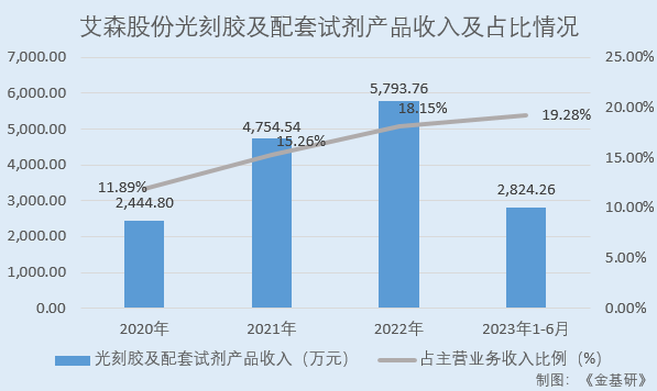 2020-2022年及2023年1-6月,艾森股份光刻胶及配套试剂产品收入分别为2,444.80万元、4,754.54万元、5,793.76万元、2,824.26万元,占主营业务收入的比例分别为11.89%、15.26%、18.15%、19.28%,均呈逐年提升趋势。