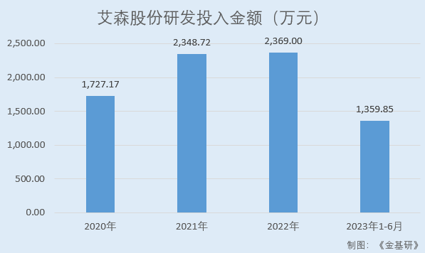 研发投入资金方面,2020-2022年及2023年1-6月,艾森股份研发投入金额分别为1,727.17万元、2,348.72万元、2,369.00万元、1,359.85万元,占营业收入的比例分别为8.27%、7.47%、7.32%、8.83%。其中,2023年1-6月艾森股份研发投入金额同比增长23.81%。