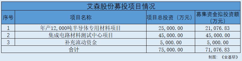 此番上市,艾森股份拟募集资金7.11亿元分别用于“年产12,000吨半导体专用材料项目”、“集成电路材料测试中心项目”、“补充流动资金”。