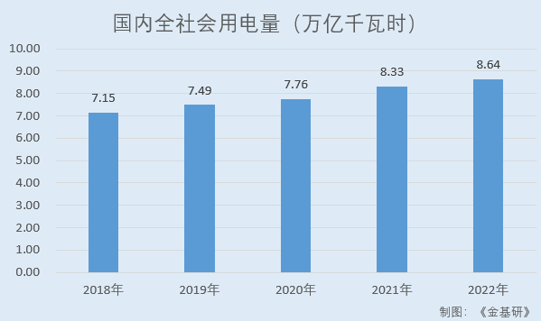 据国家统计局数据,2018-2022年,国内全社会用电量分别为7.15万亿千瓦时、7.49万亿千瓦时、7.76万亿千瓦时、8.33万亿千瓦时、8.64万亿千瓦时。